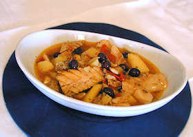 Ingredienti: stoccafisso, olio d'oliva, cipolla, pomodorini, pinoli, aglio, carciofi, prezzemolo, peperoncino, patate.